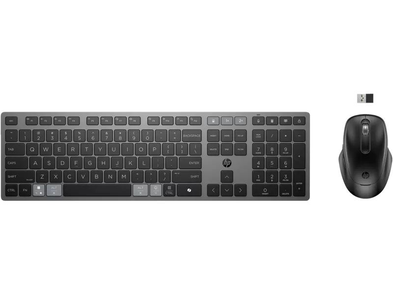 Die HP Kombi aus wiederaufladbarer kabelloser Tastatur und Maus für mehrere Geräte besteht zu mindestens 60 % aus recyceltem Haushaltsmaterial